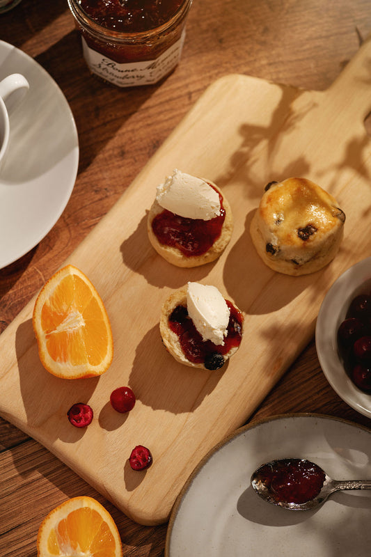 Cream tea consists of Classic English Scones, clotted cream, and jam. Mrs. Bakewell's Classic English Scones are different than the American version of scones as you won't be finding any sugar glazes on top.